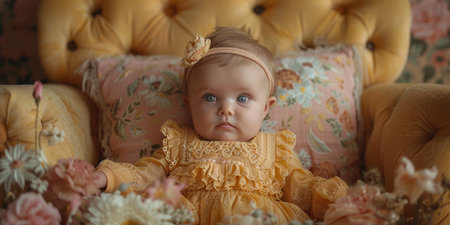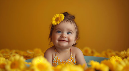 Adorable baby filled with joy and happiness gazes up at the camera in a charming studio setting.