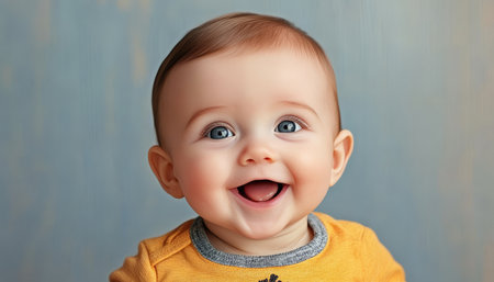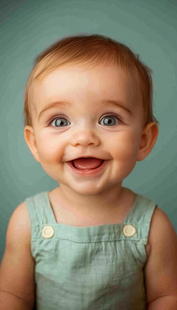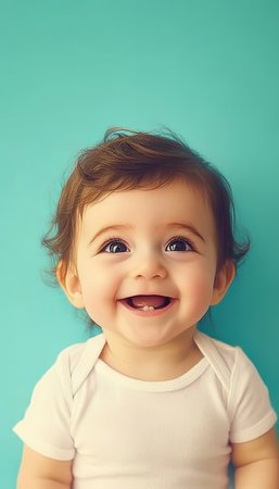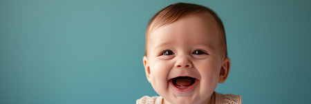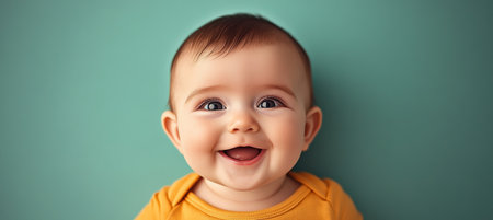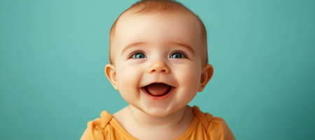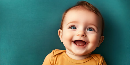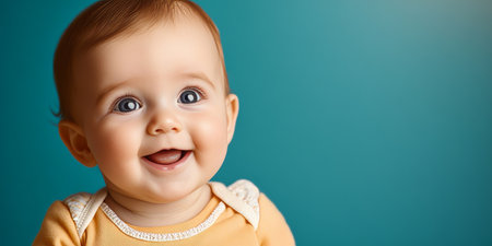 Adorable Baby Smiling Joyfully in a Teal Background, Capturing Innocence and Pure Happiness Moments