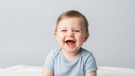 A close-up portrait shows a laughing baby with open mouth. The infant wears a light blue onesie against a neutral background. The image has soft lighting highlighting the child's face. Suitable for various uses, this image captures a moment of pure happiness and could be used for advertising or editorial content.