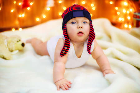 Cute little baby and blurred Christmas lights on background, space for text. winter holiday