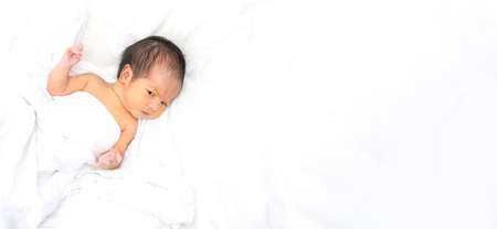 Cute newborn baby girl in white blanket on nursery bed. Adorable newborn child, little boy eyes look people Family, new childhood, infant soft skin portrait concept. Jaundice syndrome life hospital.