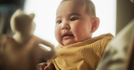 Mother and Baby Bonding Moment: Authentic Shot of an Asian Woman New to Motherhood Playing with her Cute and Curious Child in the Morning at Home. Mother Using a Toy to Talk to