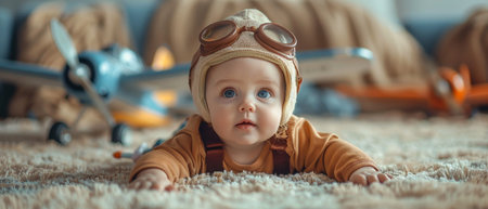Baby, in a pilot hat, plays imaginatively with airplane toys, creating a fun and adventurous atmosphere
