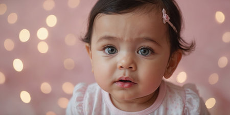 AI Generated. closeup face of an adorable baby girl on pastel pink background with bokeh light and copy space