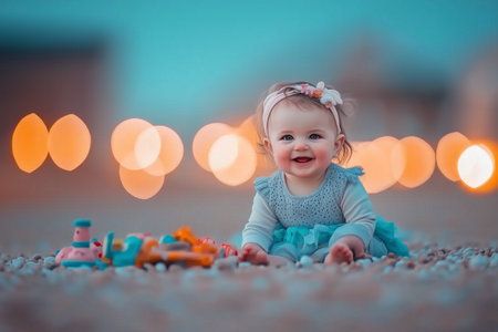 A delightful image of a baby girl happily sitting on the beach, surrounded by colorful toys, evoking joy and carefree moments amidst a soft, blurred background.
