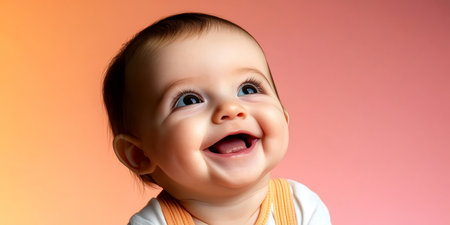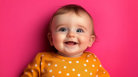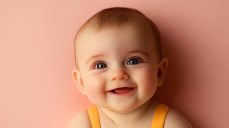 Adorable baby with a joyful expression, capturing pure happiness against a soft pink backdrop.