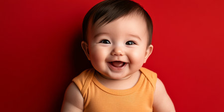 Joyful baby portrait on solid red backdrop, showcasing happiness and innocence in a sweet smile.