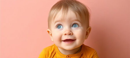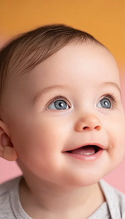 Adorable blue-eyed baby smiling joyfully while gazing upward against a soft pastel background.