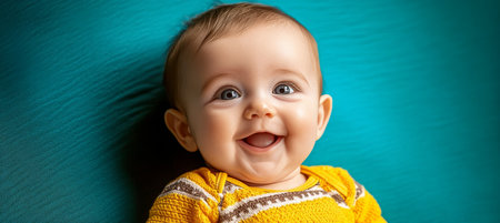 Adorable Infant with Bright Smile, Capturing Joy and Innocence of Early Childhood Moments in Teal