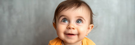 Adorable baby with a bright smile looking up at the camera, innocent and happy on a grey background