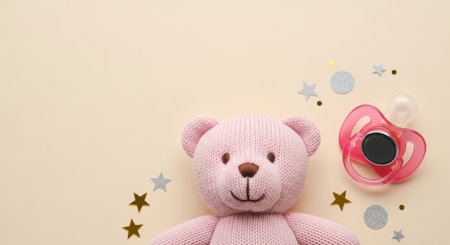 Soft pink knitted plush bear and pacifier with glitter stars on beige background for newborn baby shower celebration.