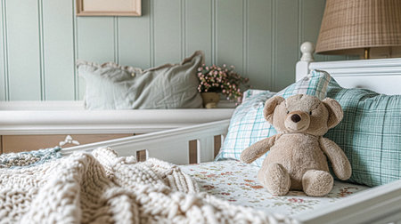 Cozy nursery with a plush bear sitting in a crib surrounded by soft colors and greenery