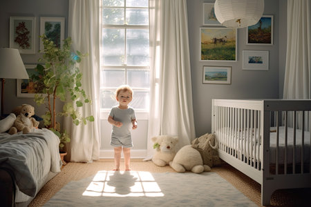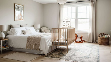 Bright and airy nursery with a crib, colorful decor, and soft textures, providing a comforting and playful space for a baby
