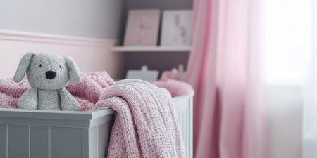 Soft pink and gray child room with simple decor and cozy blankets. Generative AI