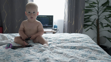 Close-up Happy playful kid 10 month old. Newborn boy bites the TV remote control on soft bed. baby child waking time Childhood, motherhood, family, infant concept. children and the device