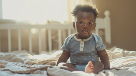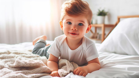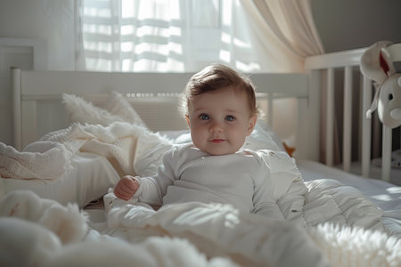 A baby boy in white sunny bedroom, Generative AI.