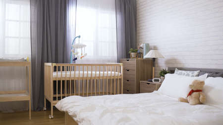 panoramic view of a contemporary bright organized bedroom equipped with a baby bed and a diaper change.