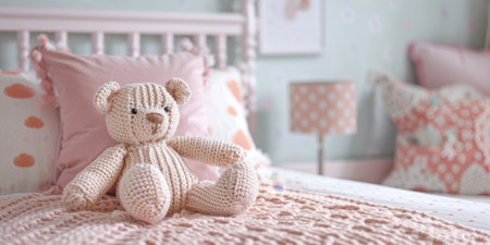 knitted teddybear in girly pastel bedroom