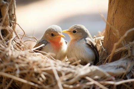 little birds pecking each other near a nest, created with generative ai