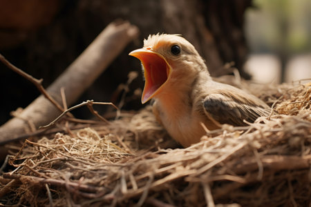 Hungry baby bird chirping loudly in nest waiting for parents to bring food