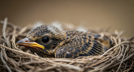 A delicate close-up shot of a baby bird, or fledgling, resting comfortably in its twig nest. The young chick has soft, downy feathers and looks alert, symbolizing new life, vulnerability, spring, and the beginning of a journey.