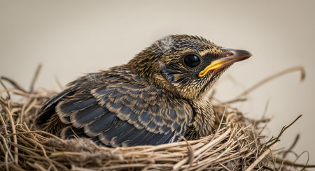 A detailed close-up of a young baby bird nestled comfortably in its nest. The fledgling, with its developing feathers and curious expression, represents new life, vulnerability, and the nurturing aspects of nature during springtime.