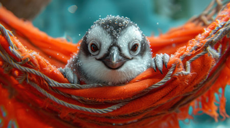 Cute little penguin in orange hammock. Winter time.