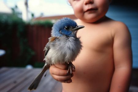 An AI generated illustration of An adorable blue bird perched atop a human hand, looking contentedly into the distance