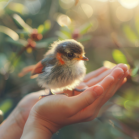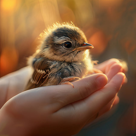 Tender and Intimate Scene of a Baby Bird Held in Human Hands