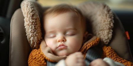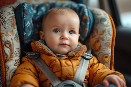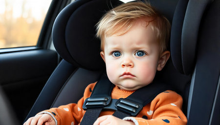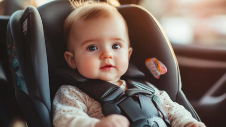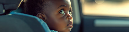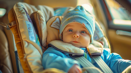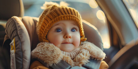 A charming baby enjoys a moment of wonder in a car seat, gazing out the window during a beautiful golden hour. This image captures the pure essence of childhood.