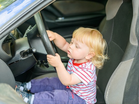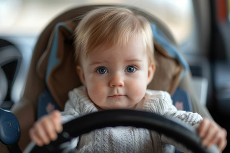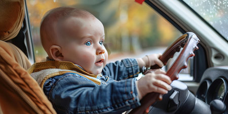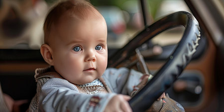 Young child eagerly engaging with a car's steering wheel, evoking themes of curiosity, playfulness, and growing up. The enchanting scene captures the innocence of childhood exploration and fun.