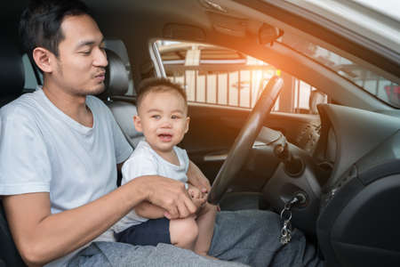 Asian Little son cry driving car with father for going travel, happy family leisure in holiday weekend.