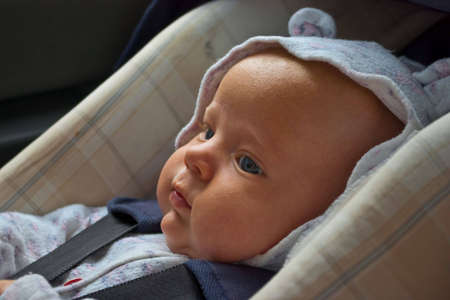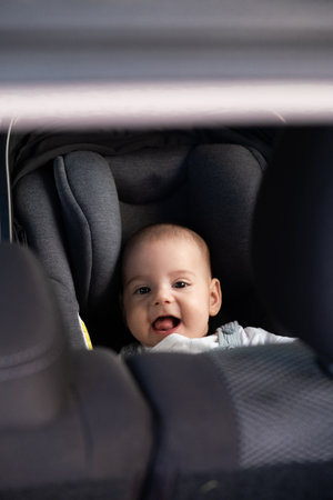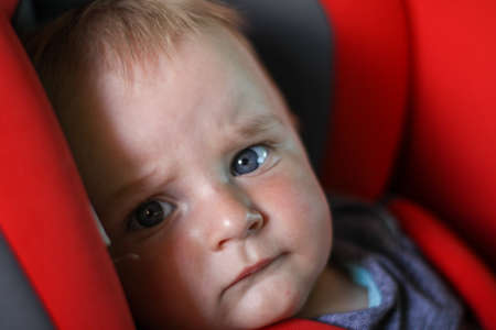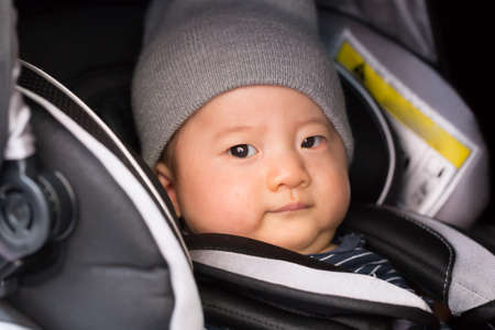 Portrait of baby boy sitting in car seat. Child transportation safety concept