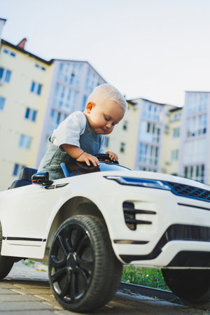 A 1-year-old boy in summer overalls rides a car. Plastic car for children. Happy smiling child playing outside.
