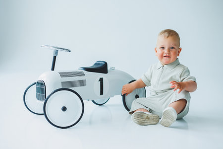 A joyful baby beside a vintage toy car captures innocence and happiness, making it perfect for marketing childrens products and celebrating the beauty of childhood