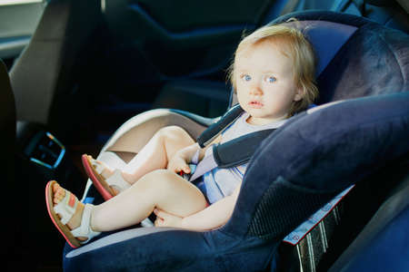 Adorable toddler girl in modern car seat. Little kid traveling by car. Child safety on the road. Trip with a baby.
