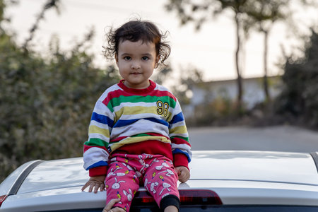 Baby trying to stand on the hood of the car parked on the side of the road. Summer vacation fun. Beautiful young girl. Happy family.