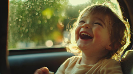 A toddler sits in the back seat of a car, laughing joyfully while sunlight streams through the window. Raindrops adorn the glass, enhancing the cheerful mood of the moment.