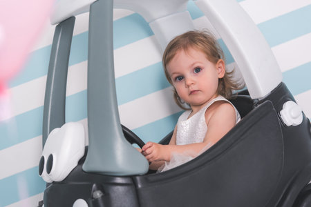 Cute little girl in white dress is looking at camera while sitting in the toy car, on light background