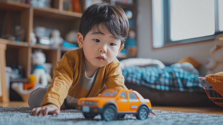 A young girl is seated on a floor at home, engrossed in playing with a small toy car. Generative AI