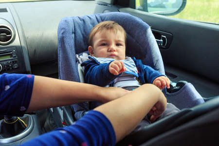 baby car seat for safety. Cute boy in safety car seat with safety belt locked protection. Protection in the car.
