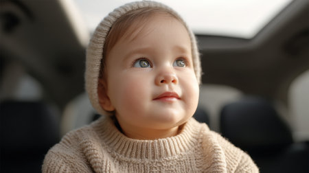 A charming toddler in a knitted sweater and hat gazes out a car window, capturing a moment of wonder and innocence on a serene day filled with soft lighting.
