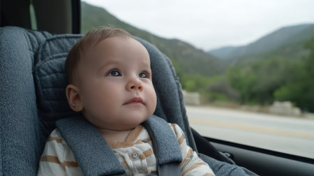 A young baby sits securely in a car seat, gazing out of the window during a road trip, surrounded by scenic mountain landscapes and overcast skies.