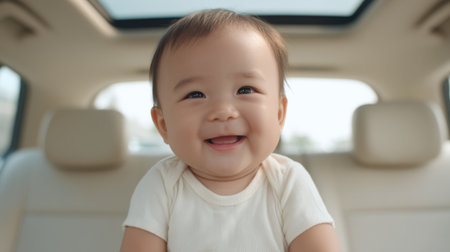 A cheerful baby smiles broadly while seated in a car, capturing moments of joy and innocence, illuminated by sunlight filtering through a glass roof.