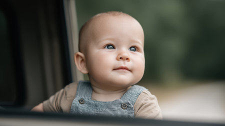 A charming baby gazes upward from a car window, showcasing a delightful moment filled with innocence and joy. The soft light creates a serene atmosphere in nature.