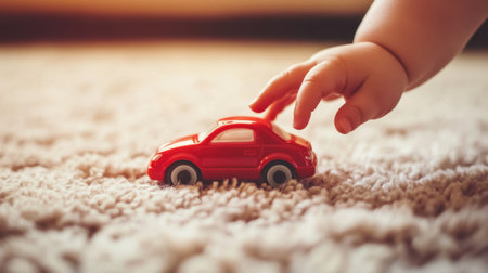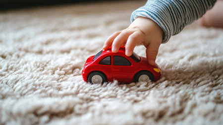 A toddler's hand pushing a red toy car across a fluffy carpet, emphasizing a playful and warm atmosphere