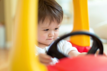 Littel boy 1 year old with black t shirt on toy car. Cute child concept.