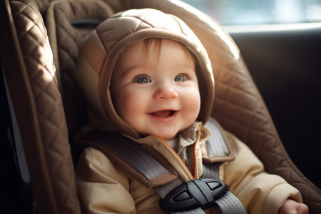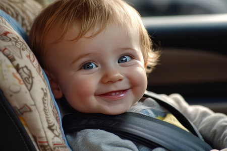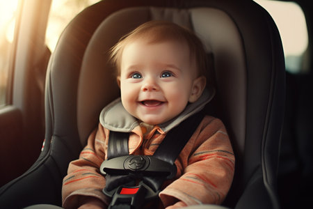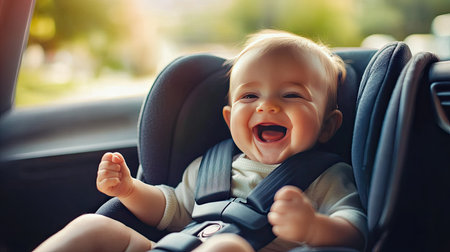 Joyful toddler securely buckled in car seat enjoying a bright and sunny day adventure