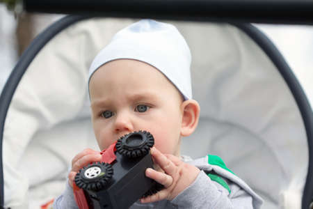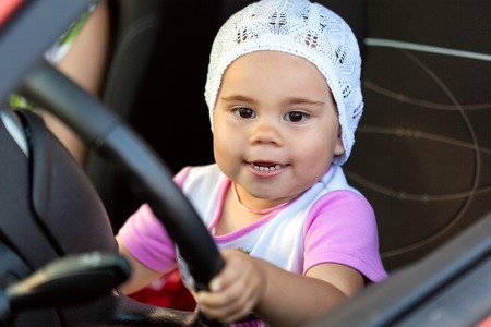 Portrait of cute baby boy sitting behind steering wheel and looking at camera