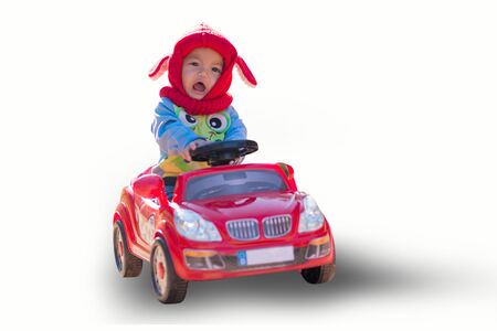 Asian child boy happy and smiling in a red hat in a red toy car on white Background,Background isolation
